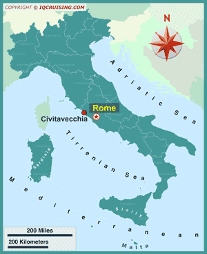 Rome is around 45 miles (73km) southeast of the port in Civitavecchia. Because of the proximity to the Eternal City, almost all cruise lines list the port on their Mediterranean itineraries as "Civitavecchia (Rome)" or "Rome (Civitavecchia)" without specifying that there is some traveling involved if you want to visit the Eternal City.